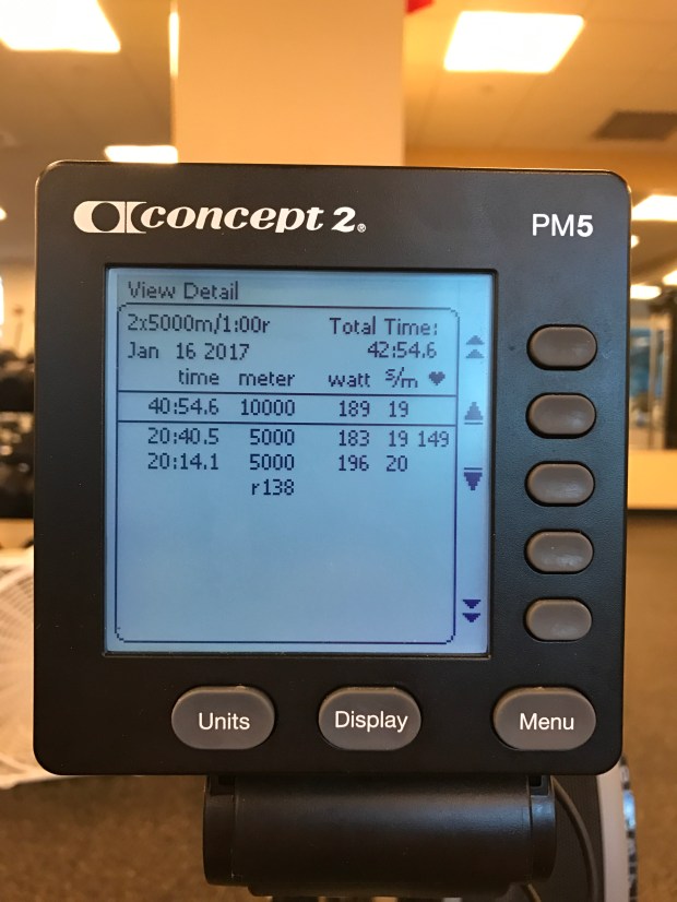 Originally, I thought I had time to do a 2×30′ session, but as I was grinding away in the first 30 minutes, I was working out the timing and logistics of getting to my dinner on time and it was clear that I didn’t have that much time. When I came into the gym, I notice a row of 4 nice new skiergs along a wall. I decided that a I just finish up the first 30 minutes on the erg, and then give the skierg a try.