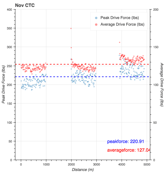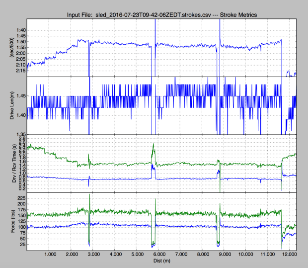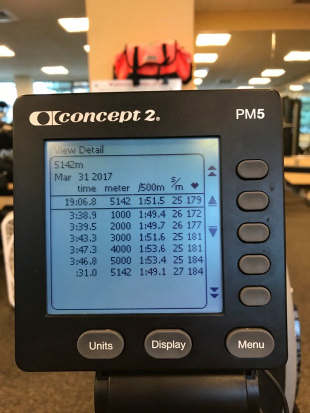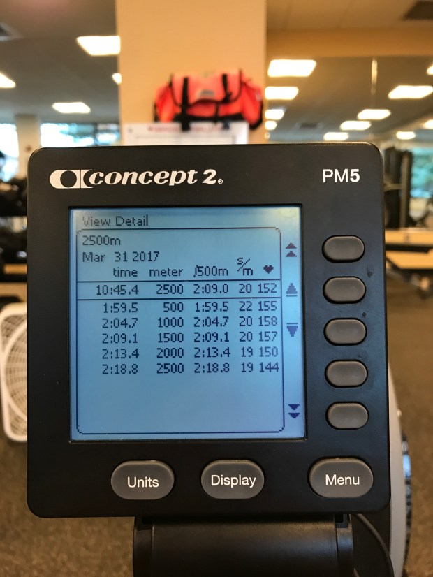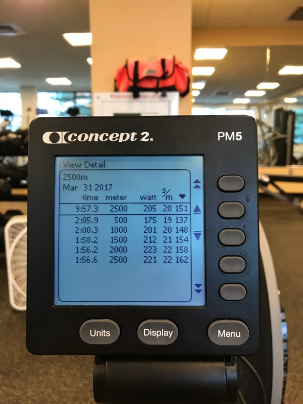 Warmup: The 1:45s were hard! And I had a lot of trouble getting the rating up. I haven’t really had my stroke rate much above 25 for the last 6 months. It showed.