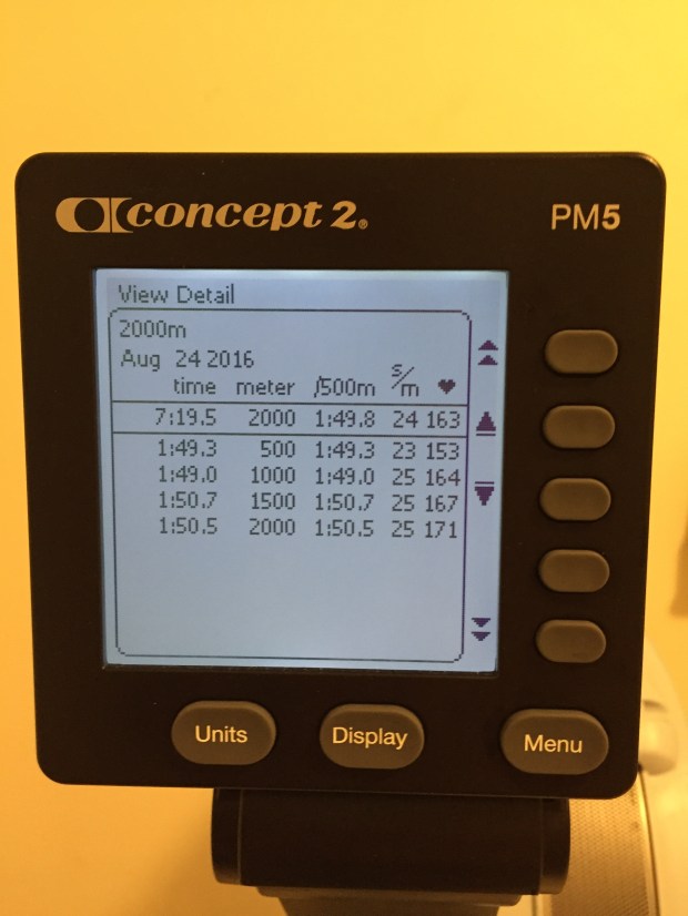 I was pretty shattered at the end of it, and I dialed up a 2k cool down. I was originally thinking that I would do a happy ending cool down with 500m at 2:00, then 500m at 2:05, 500m at 2:10 and 500m At 2:15, but I got the feeling I might pass out or throw up during the first 20 strokes at 2:00 pace, so I backed off and just tried to hit exactly 9:00 for the whole thing. I missed by 0.4sec. Another thing I’m out of practice at, I guess!