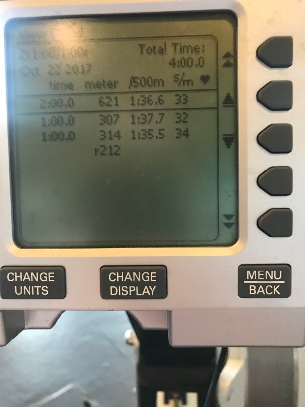 I slept in until 6 because I had nothing on my agenda until my ride to the airport at 10am. I headed down to the gym without a specific plan. I did my full PT suite of exercises. I have been neglecting them lately and that’s a bad thing. I have to find a way to fit them in with OTW rowing. I don’t feel comfortable doing them on the ground at the docks where I keep my boat and I am always rushed when I get to work afterwards. I think I might start doing them on my way out of work at night.
