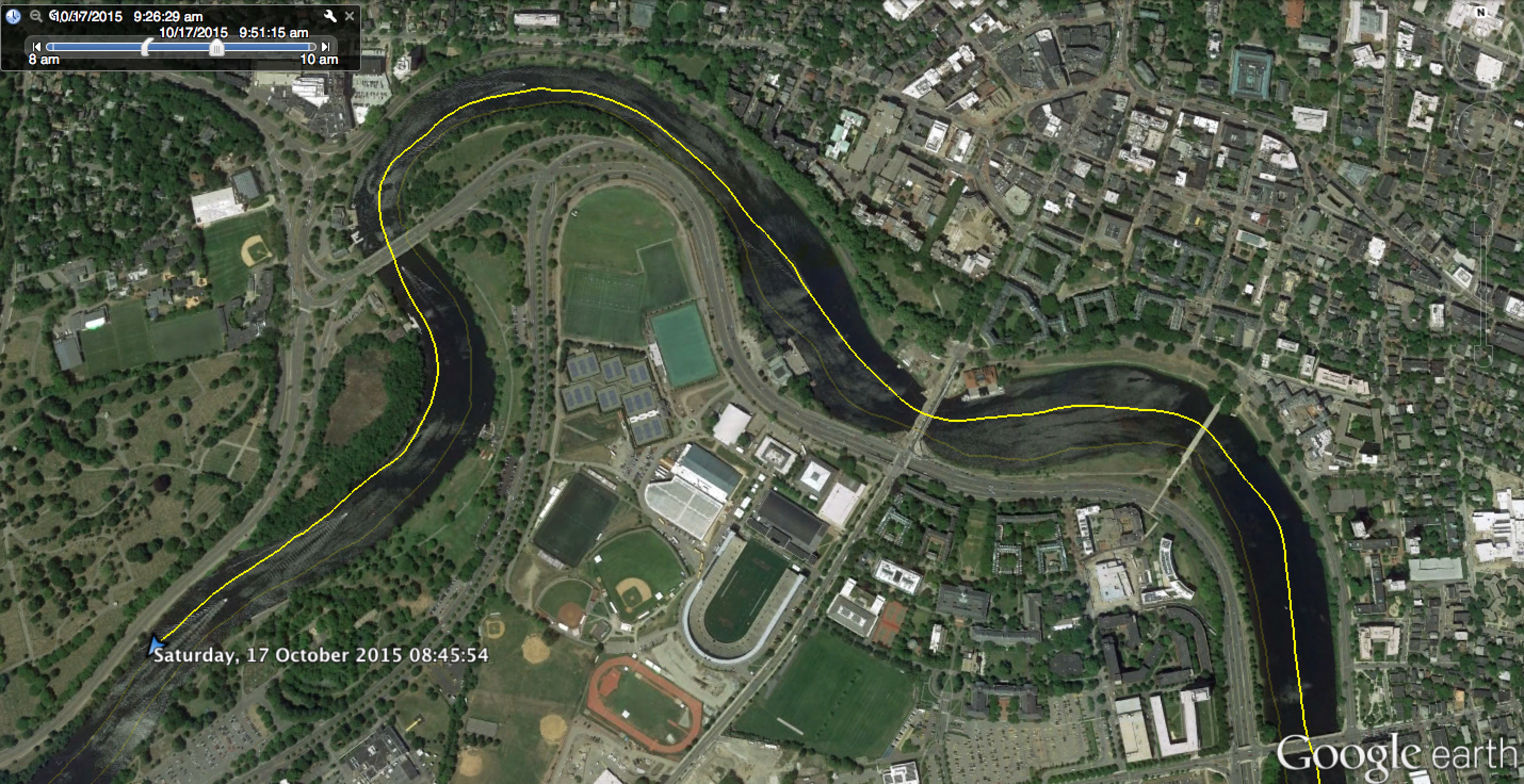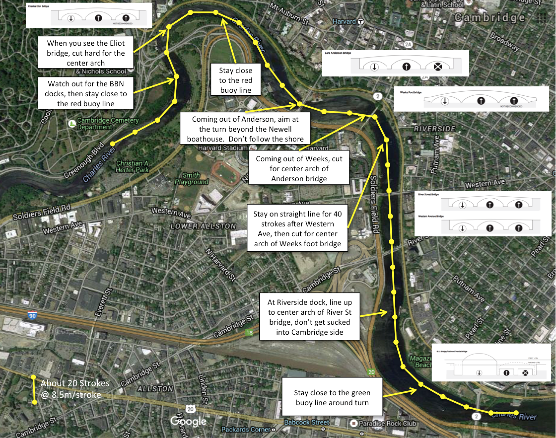 Lessons learned: Take the time to double my course at the start. Learn to use a mirror. More practice runs on the course. - I did not follow an ideal line on magazine beach, approaching River Street, in the stretch from Anderson to the Eliot turn and right at the end. This probably added about 100m to my row.