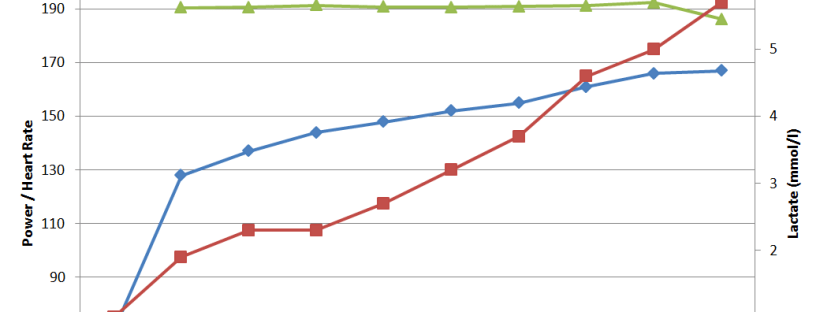 The other useful output is a first cut at appropriate steady state training power. The goal here is to train at the highest power that results in a steady state lactate level at or below 2.0mmol/ml. From this test, training power should be between 180 and 205W.