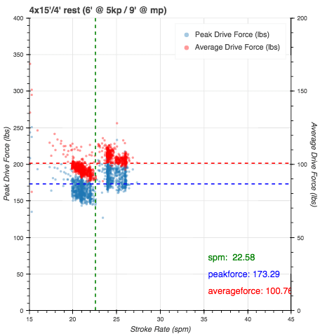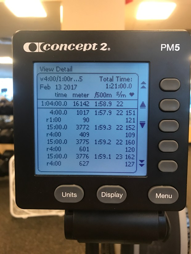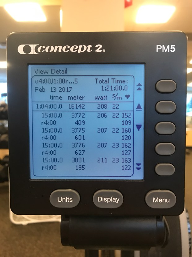 Lot’s of technology troubles today. Painsled kept hanging up the PM5. It froze during my first 15′ section requiring me to remove the batteries in the PM5 to reset everything, then it happened again in the second interval, requiring the same process to get going again. I finally gave up and used ergdata for the last 2 intervals, and it worked fine. No fun metrics though.