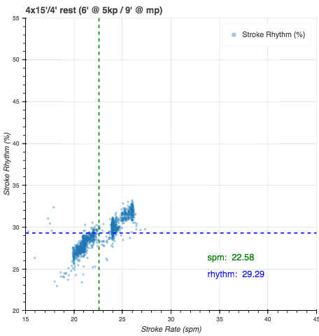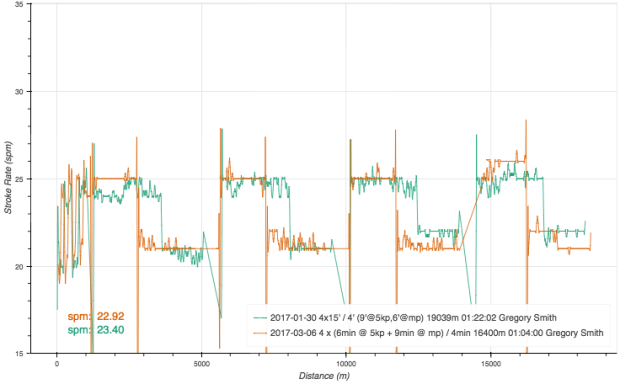 Then I gave up and used ergdata. This got the last two intervals. I noticed that I was not approaching the HR cap in the third interval, so I pushed the fourth harder and I managed to push up to the 172 cap.