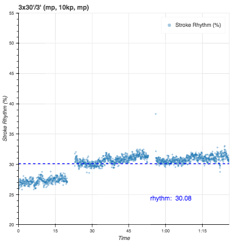 - I thought the stroke rhythm was interesting. My drive to recovery ratio was smaller in the first 30 minutes and consistent between the 10KP and final MP segments. Another indication of how my rowing changes when I am really tired.