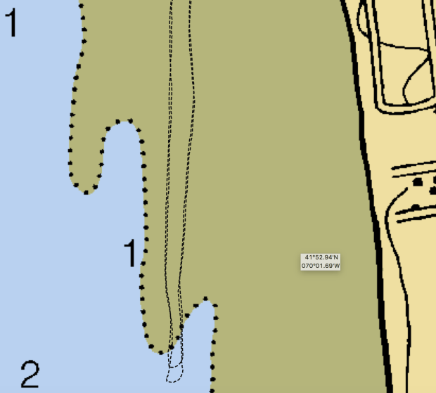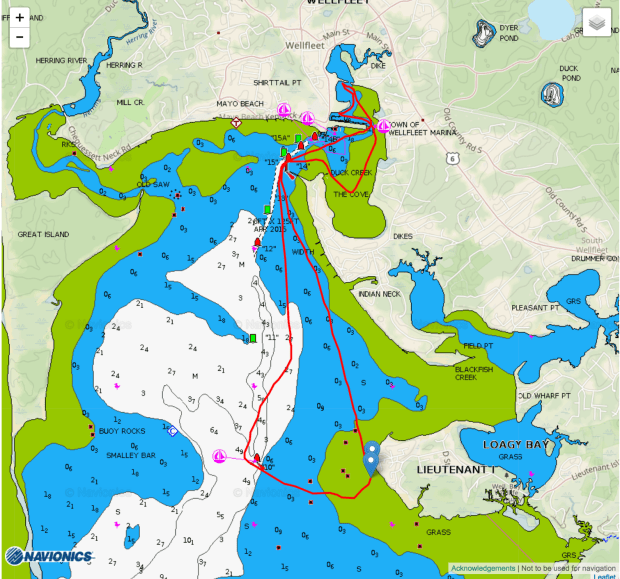 I launched from the northeast beach of the island and headed up to wellfleet harbor. The tide was coming in, so I was going with the current up along the shore of indian neck. I went into the harbor and did a broad turn up toward “The Cove”. As I came back toward the channel, there was a sailboat coming out of from behind the jetty. It’s pretty shallow where I was, and I suspected it was even shallower where they were. Sure enough, I soon heard a grinding noise and they came to a stop, aground on a sand bar. As I rowed out of the harbor, I saw them back the sails and maneuver off the bar.