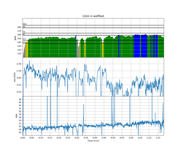 The plan was for an easy row. Try to get the feeling of rowing at a stroke rate of 20 SPM and stay in the UT2 HR zone. For a 3 to 4 hour race, I want to be doing a pace I can hold all day long!