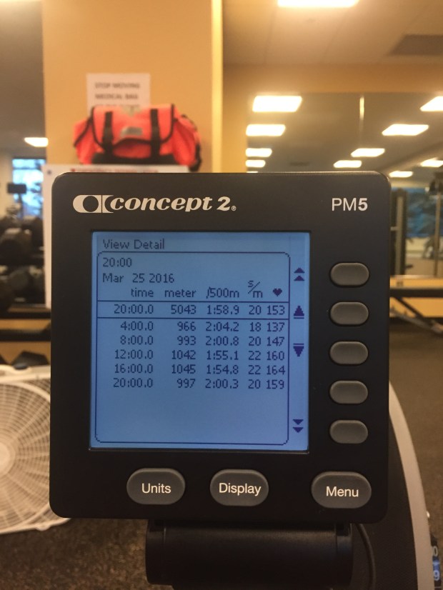 Friday – 4/5 – 20 minutes treadmill, 20 minute row