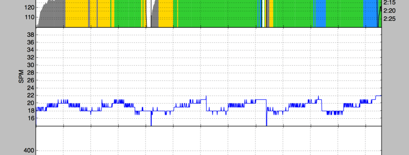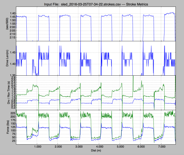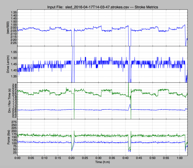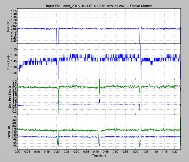 The ergdata log file was a bit more challenging to analyze. It does not log the stroke count. So, for this one, I used the distance column. For this workout, my distance per stroke should be between 10 and 15 meters.