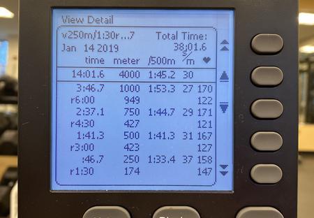 - stroke rate and pace: I tried to hold 28 for the 750s and 1000. I tried to push it up to 30 or higher for the 500s and 250s