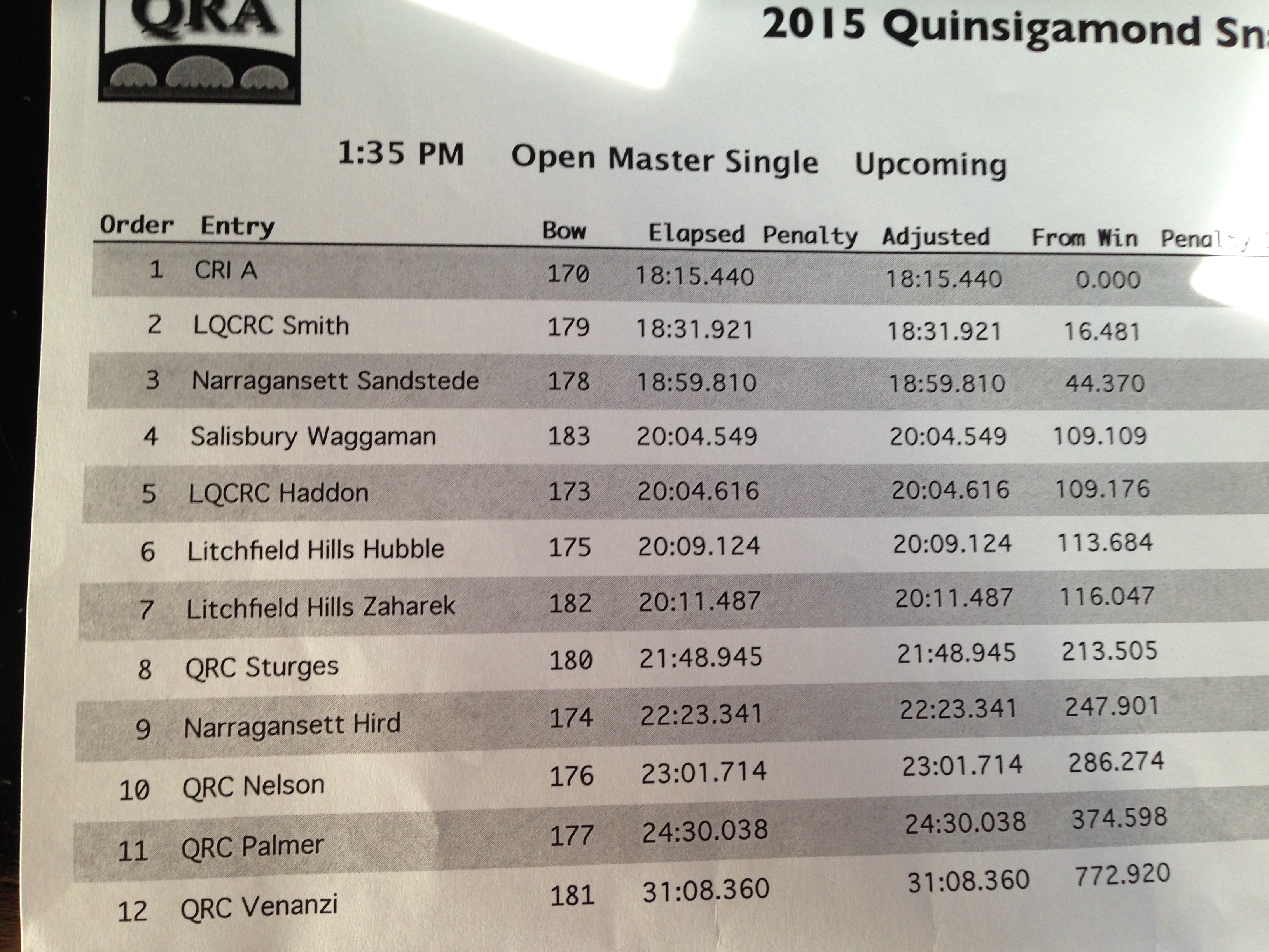 A quick bit of math revealed that I was 3.4% behind the winner. So, I was happy with that. I wanted to be within 5%. I met Dan after the race. He seems like a great guy. Former college rower, just getting back in the sport. We talked a bit and he lives quite near where I keep my boat. I tried to convince him that the place where I row would be a good spot for him too.