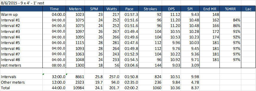 You can see that I slid some sessions around. I was scheduled for my 5 x 1500 on Monday 9/3, but I couldn’t get on the water. Instead I did an easy steady state session on the dynamic, and moved the hard sessions out by a day. I am also taking liberties with the easy sessions. My coach suggested that I use these sessions to continue to work on drills and also to include some speed work because it has value in head races for overtaking and at the finish. It also pushes me to work technique at high rates, which is a good thing.