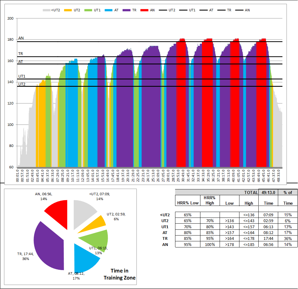 With the nice easy workout on Tuesday, I should have been well rested and ready for action on Wednesday. These short interval / short rest sessions are supposed to give me a chance to get lots of minutes in at close to head race intensity, but include enough rest so that fatigue does not become a big factor until deep into the workout.