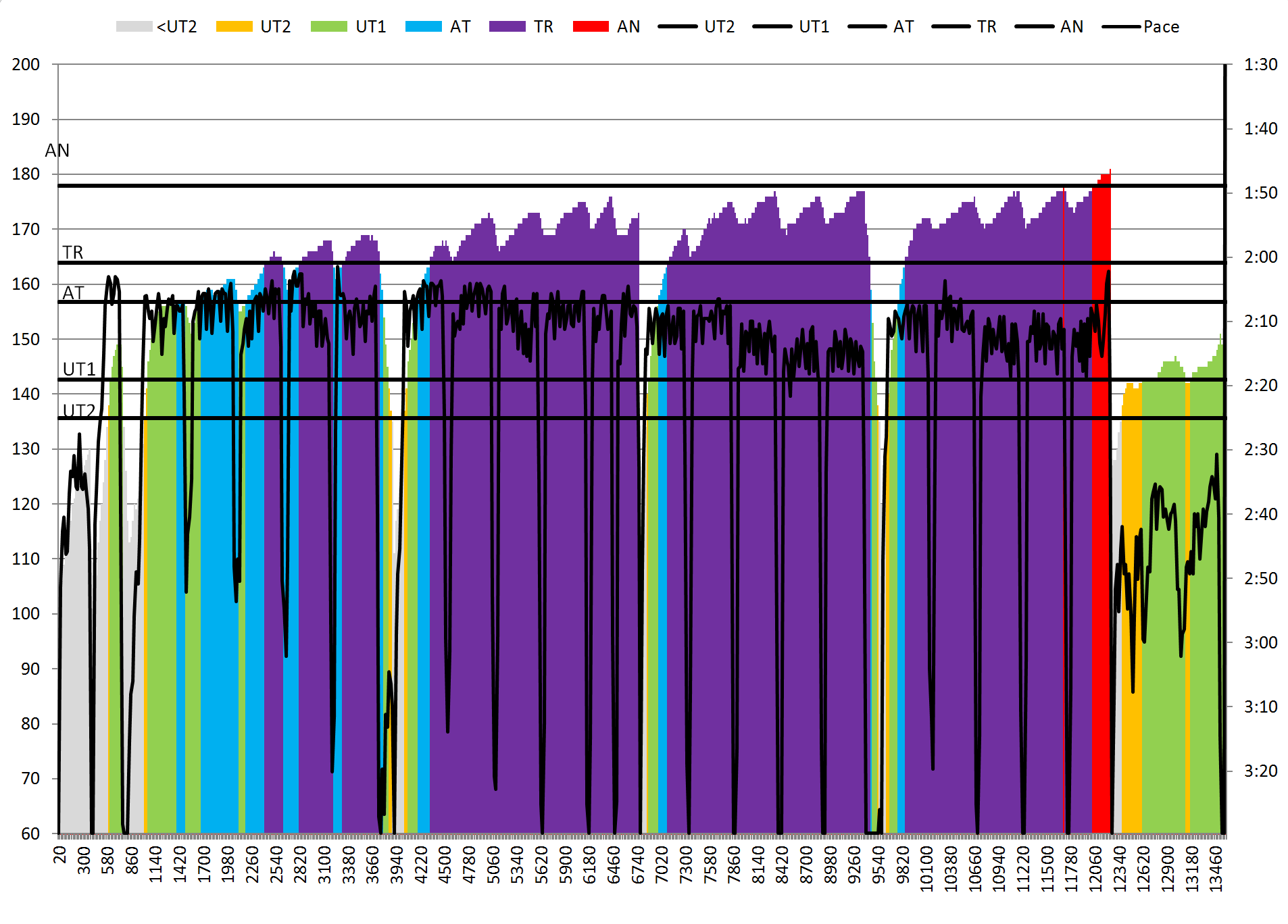 This is the real pinnacle of the weekly training plan. The long intervals. They end up being very close to head race pace and by the last one you are feeling the effects.