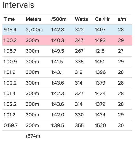 I was actually having a good time with the workout. Well, to be more accurate, I was enjoying the 1 minute blasts. 30 strokes. Focusing on clean early finishes, outward pressure on the oarlocks, early body prep and rowing with the blades off the water. I would get into the zone where I would have 4 or 5 strokes in a row that just felt great. I always love seeing a 1:xx pace on the speedcoach and there is something about the fluidesign hull. It gets super stable when you’re going fast. It’s like riding on rails.