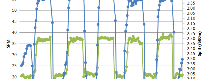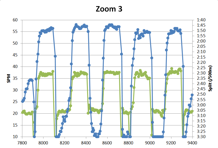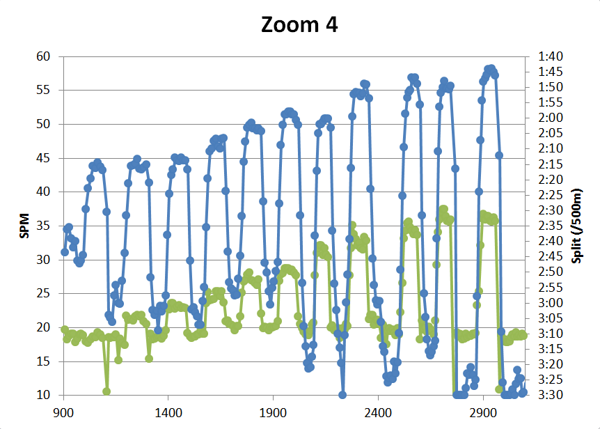 That worked out much better than I thought it would. I figured I had no chance to get the rate up to 36, but as it turned out, I was able to sustain 38 spm in the heart of the 20 stroke bursts. Mind you they weren’t pretty strokes, but they were reasonably effective.