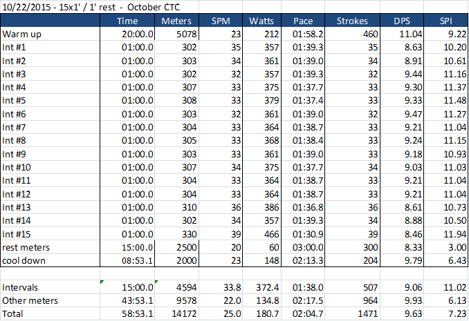 I did the same warmup as Wednesday with 10 stroke bursts at increasing stroke rates. I like it, it is a bit gentler than the Rojabo warmup.