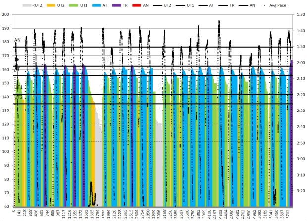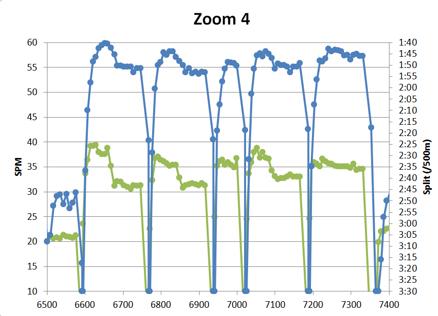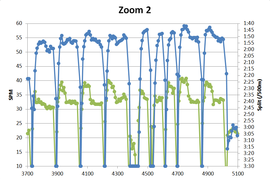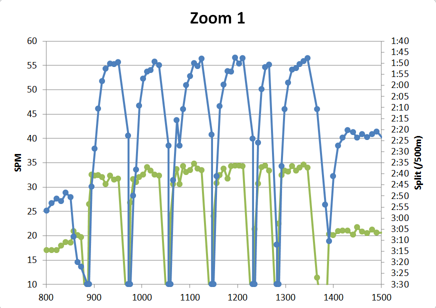 The conditions were far from perfect. There was a reasonably strong breeze. You can see the first 2 starts are downwind, then 2 upwind, then two down, then two up. The last two starts, I extended out to thirty strokes and settled to race rate, around 32 after 10 strokes.