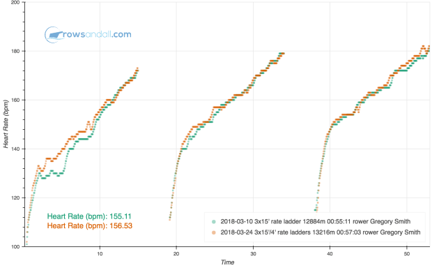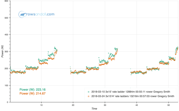 At work. Having all kinds of issues. The workout ended up in 3 different files. While doing the first interval, I discovered that I needed to go to the bathroom. It was remarkably unpleasant getting through the last 300m or so. I rushed off, too care of business, and then decided to try “rerow”, which I thought would just bring up a normal distance interval session. I was wrong. Since I had done one rep the first time, that what it did for the rerow. So, I needed to reprogram the P5 for the last 3 intervals. When I glued them together, the start time for the set of three intervals looks wrong. I didn’t wait 20 minutes between the 2nd and 3rd interval. I did however, you out too aggressively in the thrid interval and I needed to dial it back, which I did.