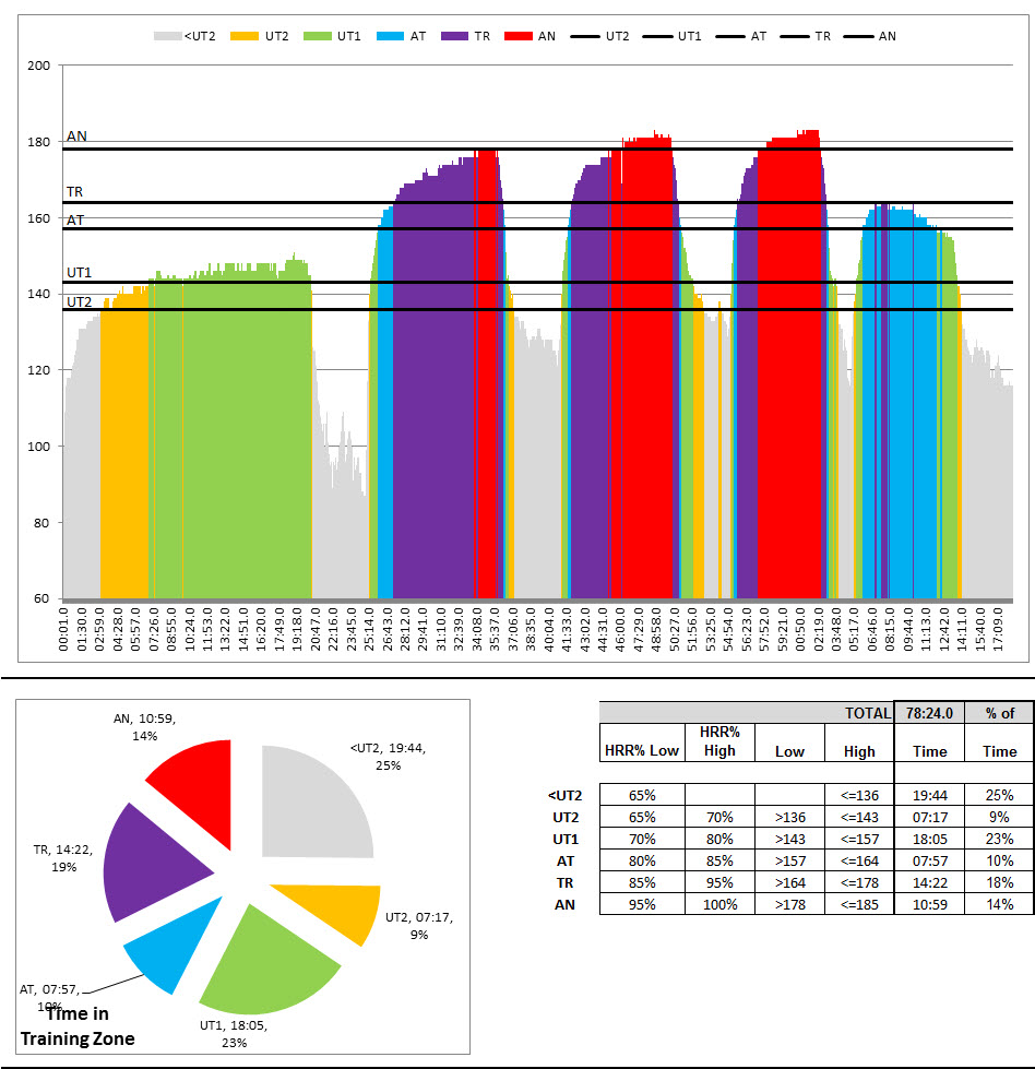 I started out with a 20′ steady state piece, to warmup and take a lactate reading. I was aiming at 185W but the first half got away from me a little bit and I found myself aat an avg of 190W with 10 minutes to go, so I stuck to 185W like glue the rest of the way. So, the lactate is probably more in line with 185W than the average shown here.