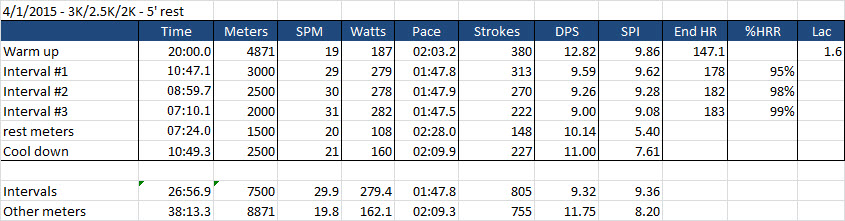The 750 during the rest felt very short and I was not looking forward to the 2K. Turns out it went fine. No crisis. HR was pretty much railed with 1 or 2 beats of my MaxHR, but I was able to stick to 1:48s through the middle 1000m, and push a little bit harder in the last 500m to get a faster last.